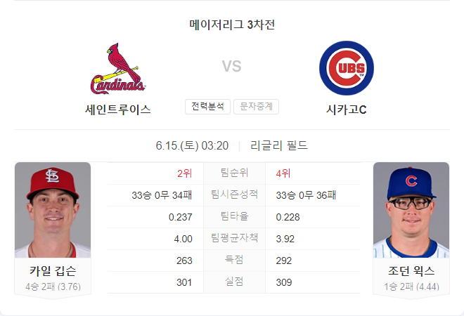 6월 15일 MLB 세인트루이스 카디널스 VS 시카고 컵스 타카짱의 경기 예측 분석