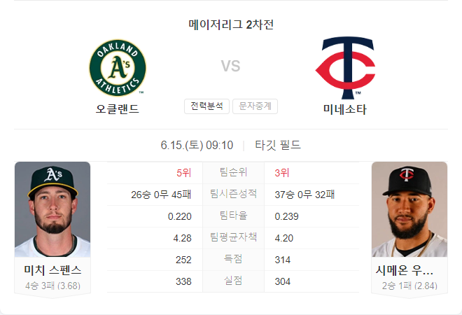 미네소타의 시미언 우즈 리처드슨은 안정적인 피칭을 펼치고 있어, 오클랜드의 약한 타선을 상대로 유리한 경기를 펼칠 가능성이 높습니다. 또한, 미네소타의 타선이 최근 경기에서 좋은 성과를 보였기 때문에 이번 경기도 다득점이 예상됩니다.