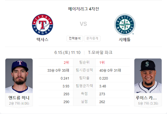 6월 15일 MLB 텍사스 레인저스 VS 시애틀 매리너스 타카짱의 경기 예측 분석