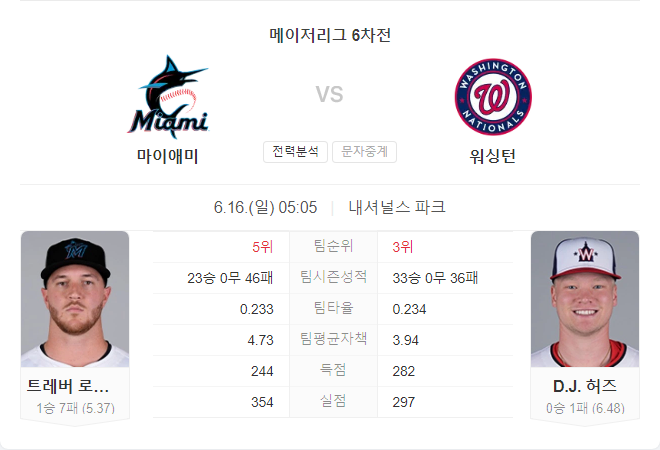 이번 경기는 워싱턴 내셔널스가 약간의 우위를 점할 것으로 예상됩니다. 마이애미 말린스는 원정 경기에서 부진한 모습을 보이고 있으며, 타격과 투구 모두에서 안정감을 찾지 못하고 있습니다. 반면 워싱턴 내셔널스는 최근 홈 경기에서 비교적 안정적인 모습을 보이며, 타격에서 꾸준한 성적을 유지하고 있습니다. 특히, 신인 투수 디제이 허즈가 마이애미의 타선을 상대로 좋은 투구를 이어갈 가능성이 큽니다.