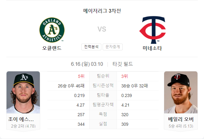 오클랜드 어슬레틱스는 최근 6연패로 인해 심각한 부진에 빠져 있으며, 타선과 투수진 모두 안정적인 모습을 보여주지 못하고 있습니다. 반면, 미네소타 트윈스는 최근 경기에서 강력한 공격력을 보이며 상승세를 타고 있습니다.