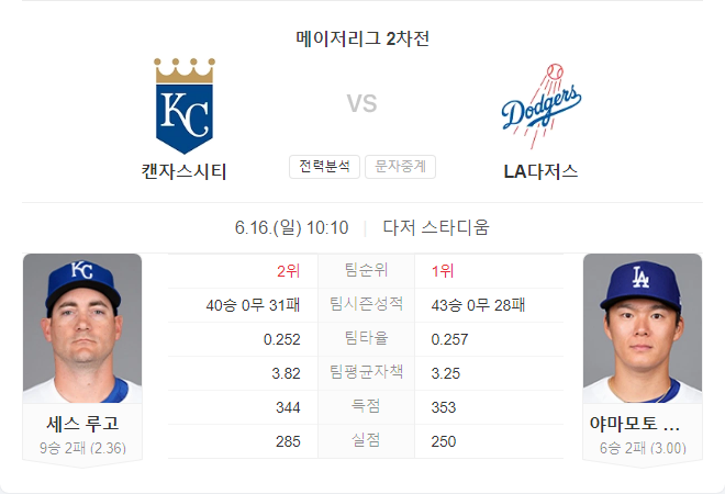 6월 16일 MLB 캔자스시티 로열스 VS LA 다저스 타카짱의 경기 예측 분석