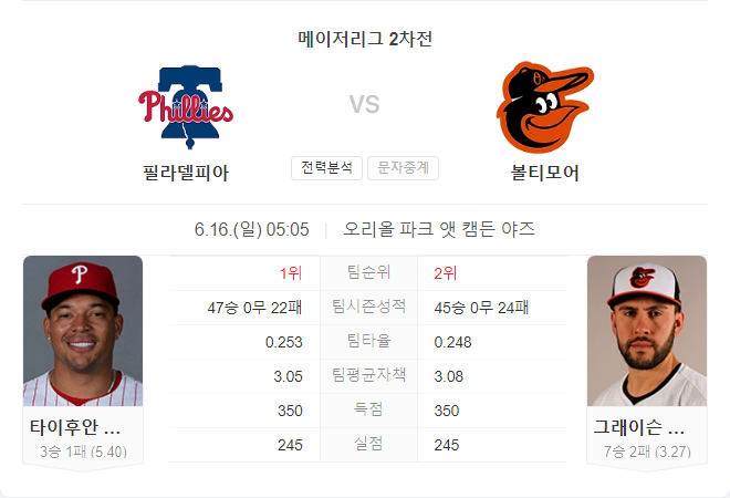 오리올스는 최근 공격력에서도 강한 모습을 보이며, 필리스의 불펜이 최근 고전하고 있는 점을 고려할 때, 오리올스가 이 경기를 유리하게 이끌어갈 것으로 보입니다.