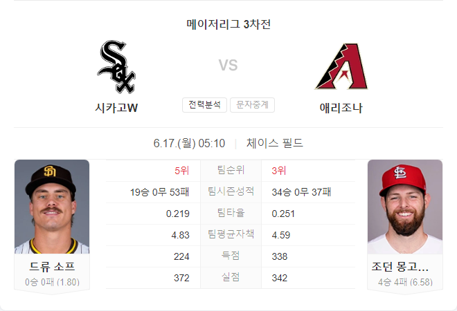 이번 경기는 애리조나 다이아몬드백스가 홈에서 시카고 화이트삭스를 상대로 우위를 점할 가능성이 매우 높습니다. 애리조나는 홈에서 강력한 모습을 보이고 있으며, 시카고 화이트삭스는 이번 시즌 전반적으로 부진한 성적을 기록하고 있습니다. 특히 드류 소프의 경험 부족이 애리조나의 강력한 타선에 어떤 영향을 미칠지가 관건입니다.