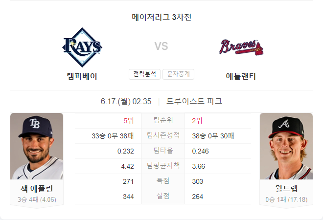 6월 17일 MLB 탬파베이 레이스 VS 애틀랜타 브레이브스 타카짱의 경기 예측 분석