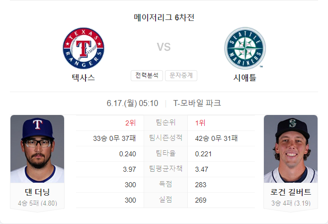 6월 17일 MLB 텍사스 레인저스 VS 시애틀 매리너스 타카짱의 경기 예측 분석