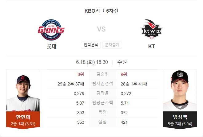 최근 KT는 타격의 부진으로 인해 연패를 당하고 있고, 롯데는 불펜의 난조로 인해 패배했습니다. 이번 경기는 이런 전개 차이가 변수로 작용할 가능성이 큽니다. 엄상백이 롯데 상대로 기복 있는 투구를 보였지만, 롯데는 최근 좌완 투수만 아니면 괜찮은 화력을 보여주고 있습니다.