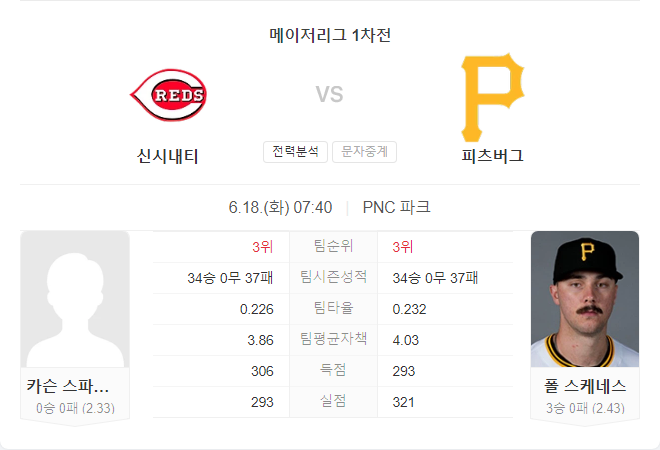반면 신시내티의 카슨 스파이어스는 이번 시즌 첫 선발 경기로 불확실성이 존재합니다. 또한 피츠버그는 최근 좋은 성적을 거두며 팀 분위기를 끌어올리고 있어 이번 경기에서도 승리할 가능성이 높습니다. 피츠버그의 승리 가능성은 약 65%로 예상됩니다.