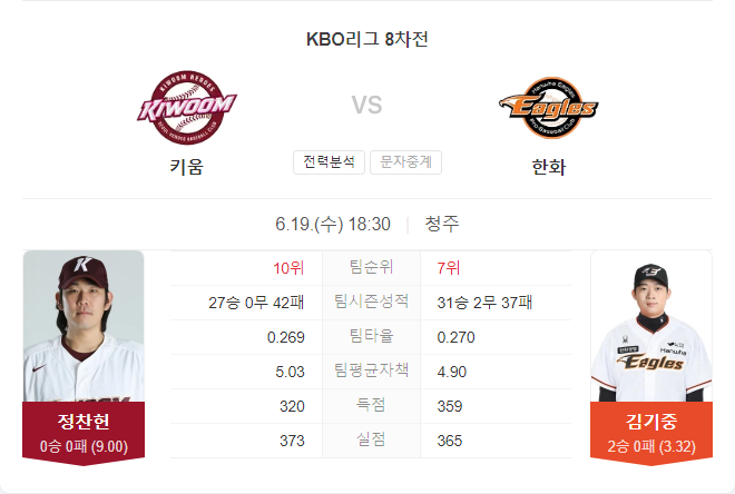 | 6월 20일 KBO 프로야구 키움 히어로즈 VS 한화 이글스 타카짱의 경기 예측 분석 (0) | 2024.06.20 |