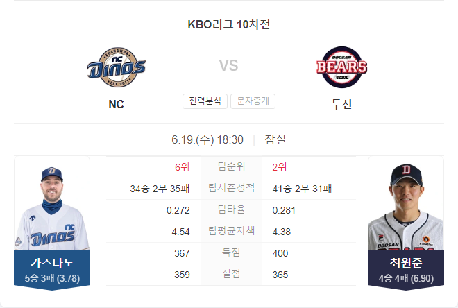 6월 19일 경기에서는 카스타노가 선발로 나설 예정입니다. 카스타노는 이번 시즌 13경기에서 5승 3패, 평균자책점 3.78을 기록하며 안정적인 모습을 보여주고 있으며, 최근 2경기에서도 좋은 성적을 거두고 있습니다. 하지만 두산 타선을 상대로 얼마나 잘 대응할 수 있을지 여부가 이번 경기의 관건이 될 것입니다.