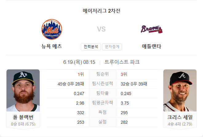 애틀랜타는 크리스 세일의 안정적인 피칭과 홈 경기 강세를 앞세워 초반 주도권을 잡을 가능성이 높습니다. 반면 뉴욕은 폴 블랙번의 최근 부진과 함께 탬파베이전 스윕 패배 이후 분위기 반전이 필요합니다. 타선에서는 양 팀 모두 강점을 가지고 있으나, 선발투수의 기량 차이와 홈 이점을 고려할 때 애틀랜타가 유리한 흐름을 이어갈 가능성이 큽니다.