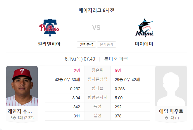 6월 19일 MLB 메이저리그 필라델피아 필리스 VS 마이애미 말린스 타카짱의 경기 예측 분석