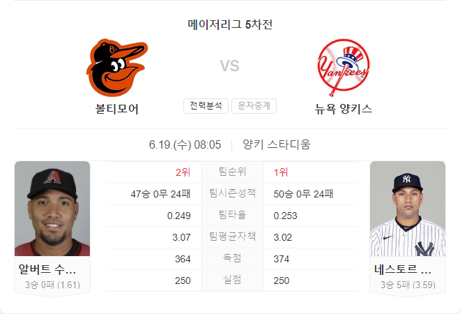 6월 19일 MLB 볼티모어 오리올스 VS 뉴욕 양키스 타카짱의 경기 예측 분석
