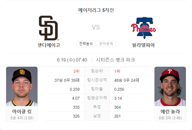 6월 19일 MLB 샌디에이고 파드리스 VS 필라델피아 필리스 타카짱의 경기 예측 분석