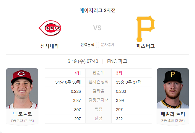 6월 19일 MLB 신시내티 레즈 VS 피츠버그 파이어리츠 타카짱의 경기 예측 분석