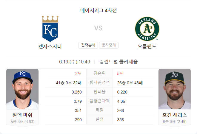 6월 19일 MLB 캔자스시티 로열스 VS 오클랜드 어슬레틱스 타카짱의 경기 예측 분석