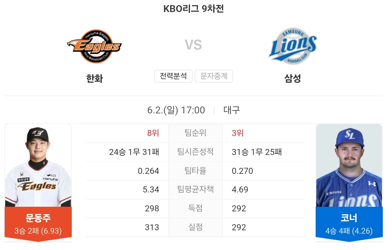 삼성 라이온즈는 박병호의 활약과 안정된 불펜 덕분에 한화 이글스를 상대로 유리한 경기를 펼칠 것으로 보입니다. 한화의 문동주가 좋은 피칭을 보여주고 있지만, 삼성이 한화 마운드를 공략하여 승기를 잡을 가능성이 큽니다.