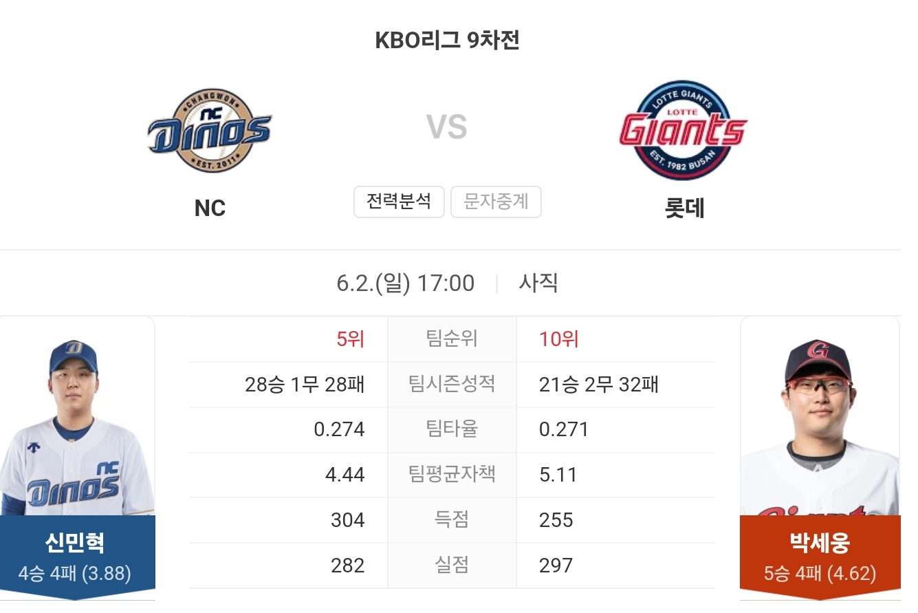 롯데 자이언츠는 박세웅이 선발로 나서며, 최근 한화 원정에서 부진한 투구를 만회하고자 합니다. 박세웅은 홈 경기에서 상대적으로 더 안정적인 모습을 보여주고 있으며, 금년 NC 상대로는 부진했지만 홈에서 나은 투구를 기대할 수 있습니다.