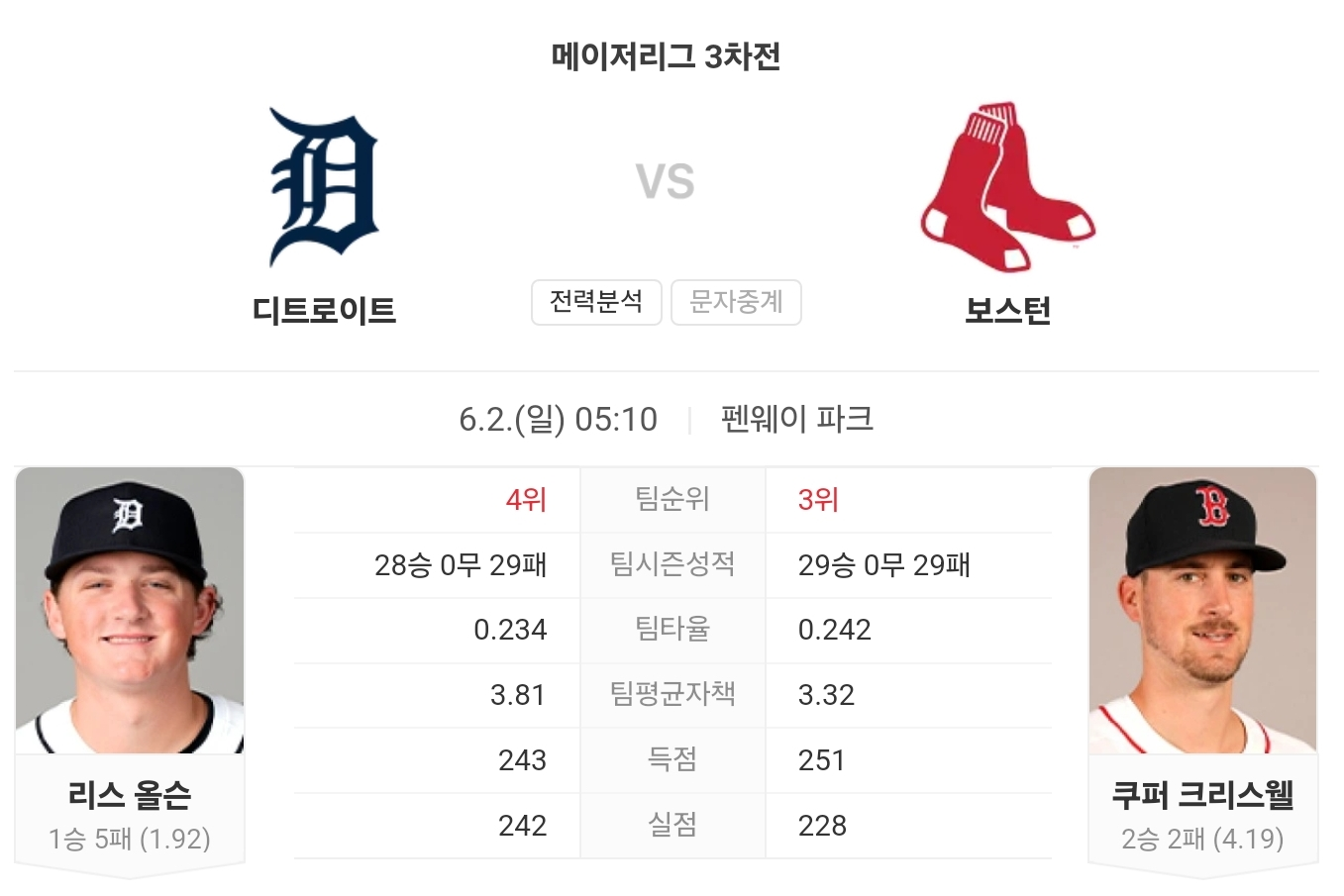 이번 경기는 디트로이트 타이거즈가 유리할 것으로 보입니다. 리스 올슨의 안정적인 투구와 보스턴 타선의 부진이 큰 영향을 미칠 것입니다. 디트로이트는 최근 3경기에서 홈런을 다수 기록하며 타선의 활약을 보여주고 있으며, 올슨은 최근 5경기에서 2실점 이하로 좋은 성적을 유지하고 있습니다.