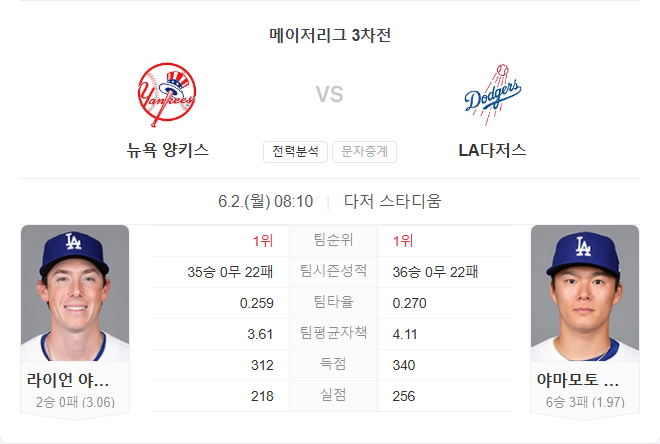 6월 2일 MLB 메이저리그 뉴욕 양키스 VS LA 다저스 타카짱의 경기 예측 분석