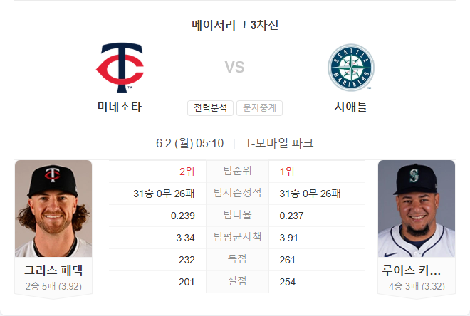 시애틀은 시즌 31승 26패로 AL 서부지구 1위를 유지 중이지만, 최근 7경기에서 2승 5패로 상승세는 꺾인 상태입니다. 홈에서는 15승 14패로 근소한 우위를 보이고 있으며, 이번 시리즈 두 경기 모두 연장전 접전으로 진행되어 체력 소모도 누적된 상황입니다. 타선은 시즌 팀 타율 .237로 트윈스와 비슷한 수준이며, 홈에서는 .216에 불과해 공격력에서 아쉬움을 보입니다.