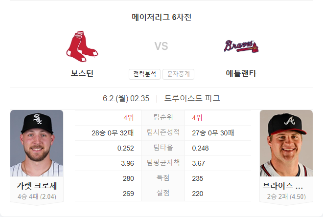 양 팀 선발 투수의 기량 차이가 뚜렷하게 드러나는 매치업입니다. 보스턴의 크로셰는 원정에서 더욱 강한 퍼포먼스를 보이고 있으며, 최근에도 탈삼진 능력을 바탕으로 안정적인 경기 운영을 하고 있습니다.