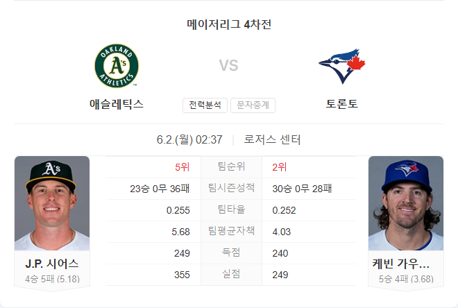 선발 케빈 가우스먼은 5승 4패 평균자책점 3.68, WHIP 0.94로 안정적인 투구를 이어가고 있으며, 홈에서는 3승 1패 평균자책점 2.93으로 더욱 강한 모습을 보여주고 있습니다. 최근 15이닝 동안 단 1실점만을 허용했고, 애슬레틱스를 상대로는 최근 5경기에서 평균자책점 1.62로 강한 면모를 보이고 있습니다.