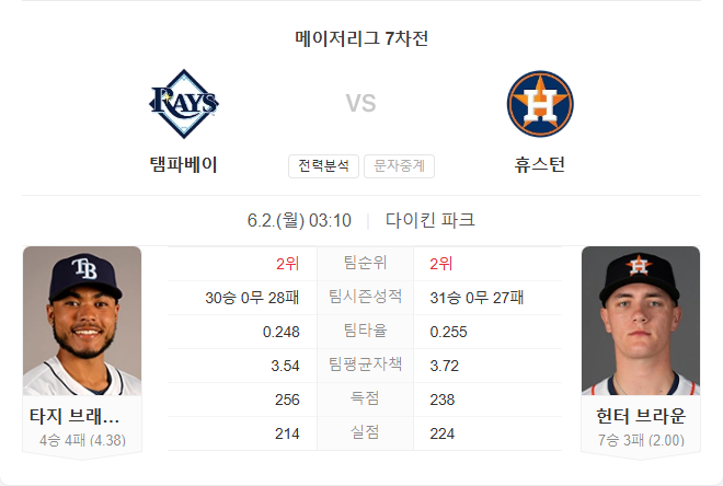 6월 2일 MLB 메이저리그 탬파베이 레이스 VS 휴스턴 애스트로스 타카짱의 경기 예측 분석