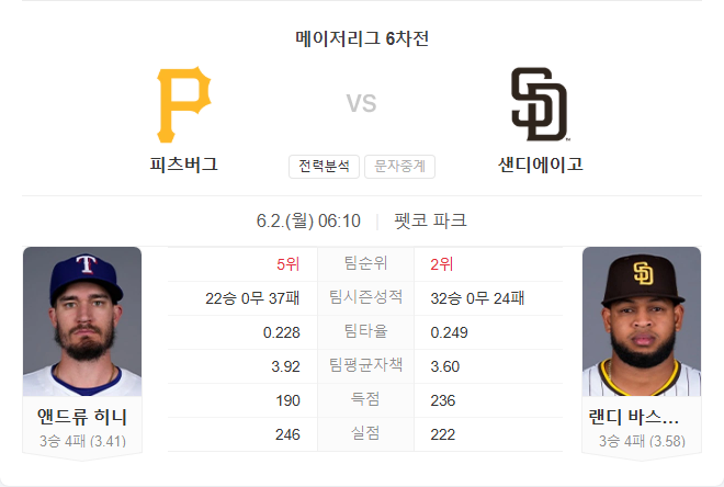 6월 2일 MLB 메이저리그 피츠버그 파이어리츠 VS 샌디에이고 파드리스 타카짱의 경기 예측 분석