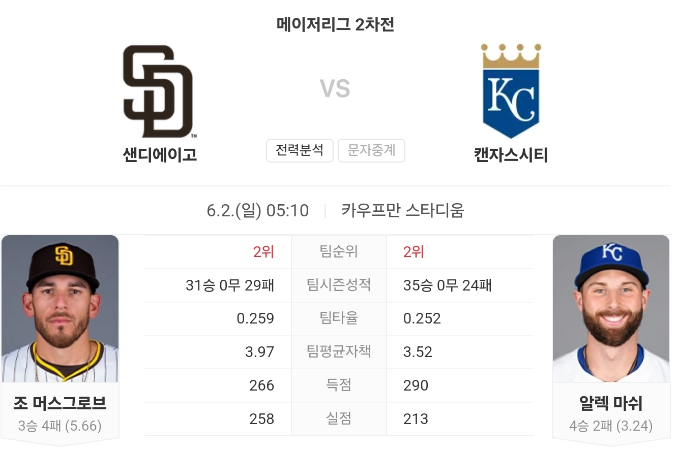 이번 경기는 캔자스시티 로열스의 승리가 예상됩니다. 샌디에이고의 선발 투수 머스그로브가 이번 시즌 부진한 모습을 보이는 반면, 캔자스시티는 홈 경기에서 강한 면모를 보여주고 있습니다. 알렉 마쉬가 안정적인 투구를 이어가고, 캔자스시티의 공격력이 샌디에이고의 투수진을 공략할 가능성이 높아 보입니다.