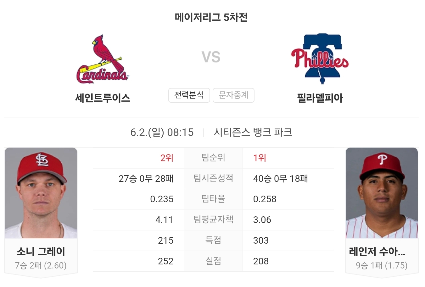 이번 경기는 필라델피아 필리스가 유리할 것으로 예상됩니다. 필리스는 강력한 타선을 보유하고 있으며, 레인저 수아레즈의 안정적인 투구가 기대됩니다. 세인트루이스 카디널스는 소니 그레이의 호투에도 불구하고 타선의 부진으로 인해 어려움을 겪을 가능성이 큽니다.