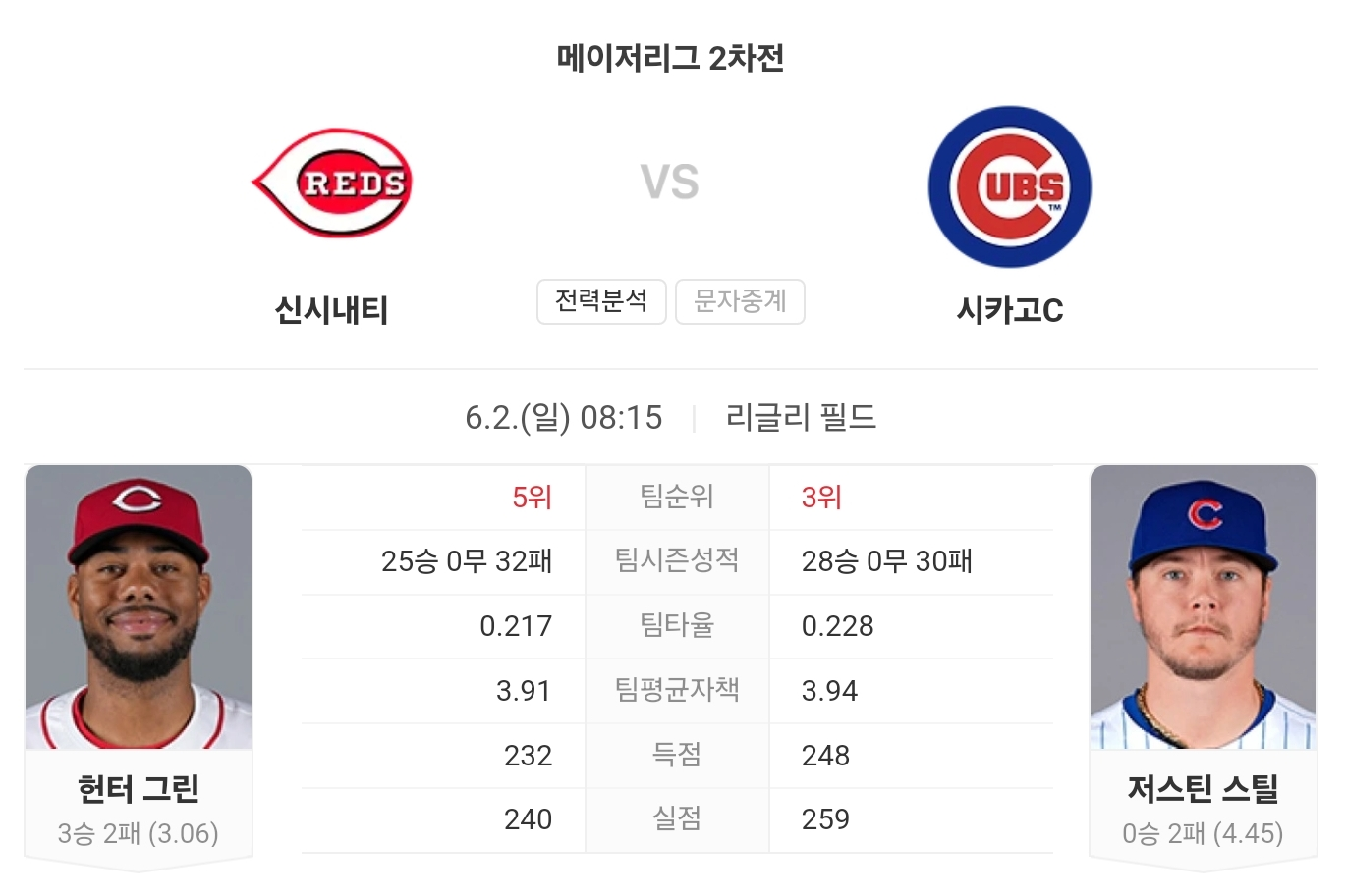 특히, 컵스의 저스틴 스틸은 레즈를 상대로 평균자책점 7.53을 기록하며 고전한 바 있습니다. 헌터 그린의 안정적인 투구와 시카고 컵스의 부진한 타선을 고려할 때, 신시내티 레즈가 승리할 가능성이 높습니다.