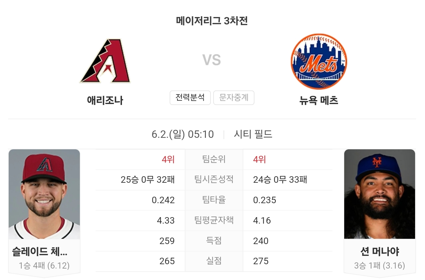 이번 경기는 뉴욕 메츠가 우세할 것으로 보입니다. 애리조나 다이아몬드백스는 최근 부진하며, 블레이크 월스턴의 경험 부족이 변수입니다. 반면, 메츠는 션 마나에아의 안정적인 투구가 기대됩니다.