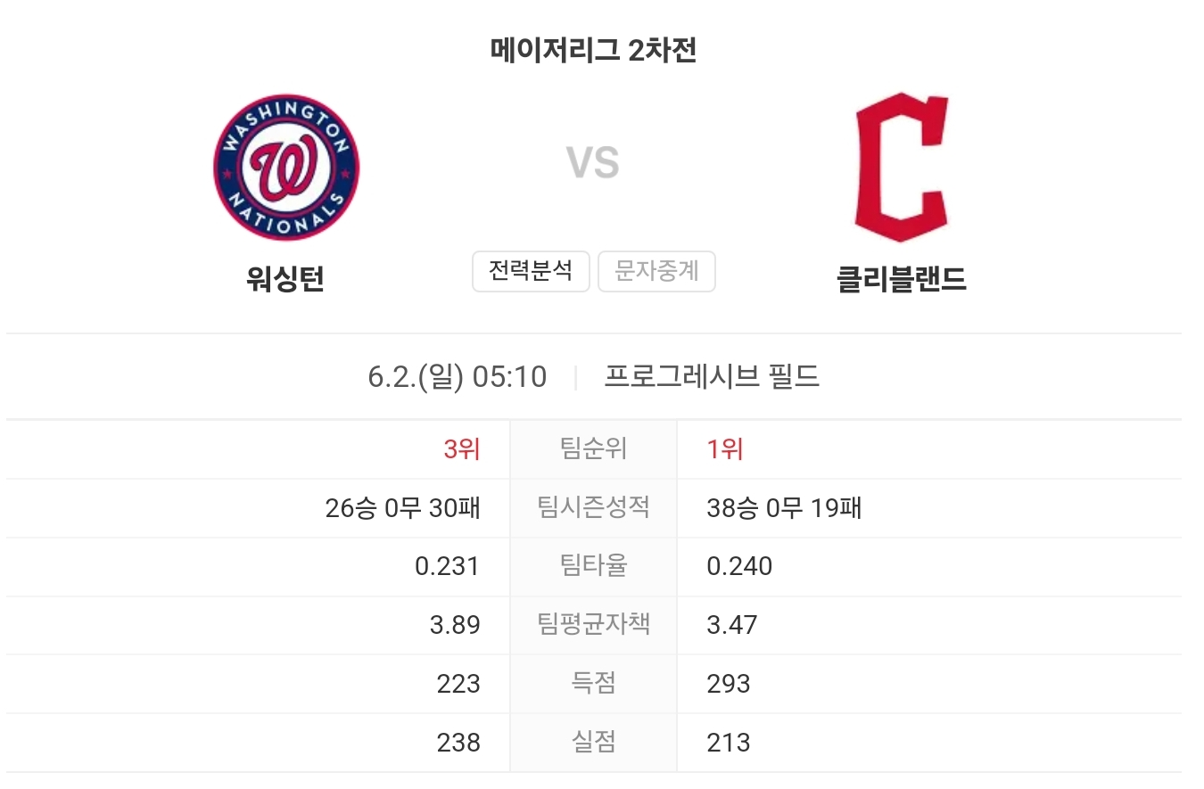 6월 2일 MLB 워싱턴 내셔널스 VS 클리블랜드 가디언스 타카짱의 경기 예측 분석