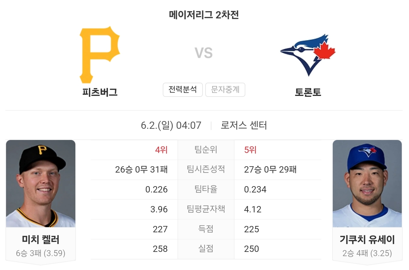 반면, 토론토의 선발 투수 유세이 기쿠치는 최근 6경기에서 모두 패배를 기록하고 있습니다. 따라서 이번 경기는 피츠버그 파이어리츠의 승리가 예상됩니다.
