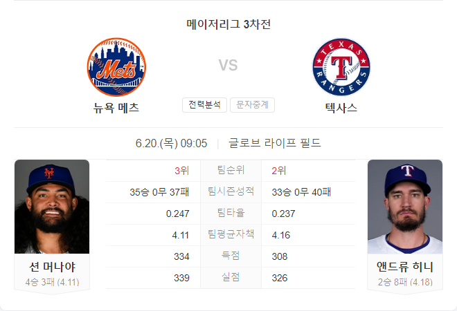 6월 20일 MLB 뉴욕 메츠 VS 텍사스 레인저스 타카짱의 경기 예측 분석