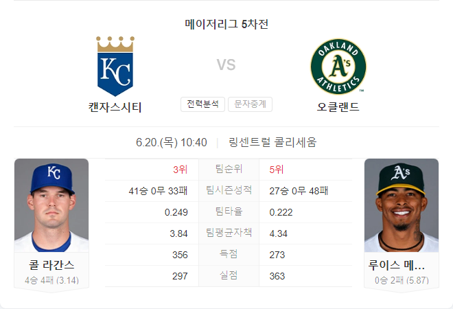 이번 경기는 캔자스시티 로열스가 유리한 위치에 있습니다. 콜 라간스가 선발로 나서는 로열스는 마운드에서의 안정감이 강점이며, 오클랜드 어슬레틱스는 최근 부진한 타격과 마운드에서의 약점을 드러내고 있습니다. 특히, 라간스는 오클랜드를 상대로 좋은 성적을 기록한 바 있어, 이번 경기에서도 그의 활약이 기대됩니다.