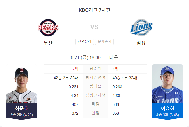 | 6월 21일 KBO 프로야구 두산 베어스 VS 삼성 라이온즈 타카짱의 경기 예측 분석 (0) | 2024.06.21 |