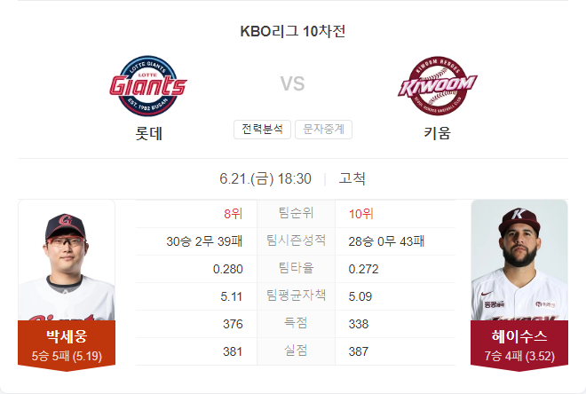 키움은 롯데에 비해 비교적 안정적인 마운드를 보유하고 있으며, 시즌 전반적인 성적은 부진했으나 롯데와의 경기에서는 강한 모습을 보였습니다. 이러한 요소들을 고려할 때, 키움 히어로즈가 이번 경기에서도 승리할 가능성이 큽니다.