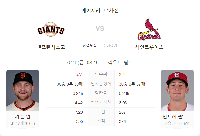 반면, 세인트루이스 카디널스는 안드레 팔란테를 내세워 자이언츠의 공격을 막아내려 합니다. 그러나 팔란테의 최근 성적이 다소 부진하여 자이언츠 타선을 막아내기 어려울 수 있습니다. 따라서 자이언츠가 이 경기를 주도할 가능성이 높습니다.