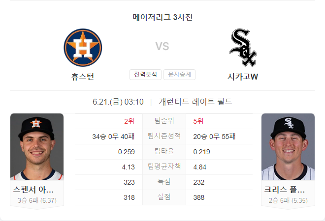 6월 21일 MLB 휴스턴 애스트로스 VS 시카고 화이트삭스 타카짱의 경기 예측 분석