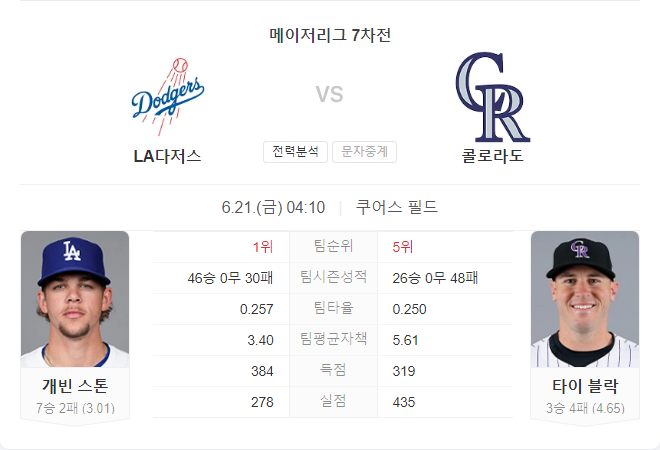 다저스의 게빈 스톤이 선발로 나서며 로키스의 타이 블락을 상대로 우위를 점할 가능성이 높습니다. 다저스는 타격에서도 우세한 모습을 보이고 있어, 이번 경기에서도 좋은 성적을 기대할 수 있습니다.