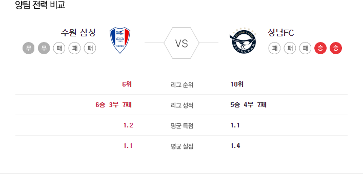 6월 22일 K리그2 수원삼성 VS 성남 타카짱의 경기 예측 분석