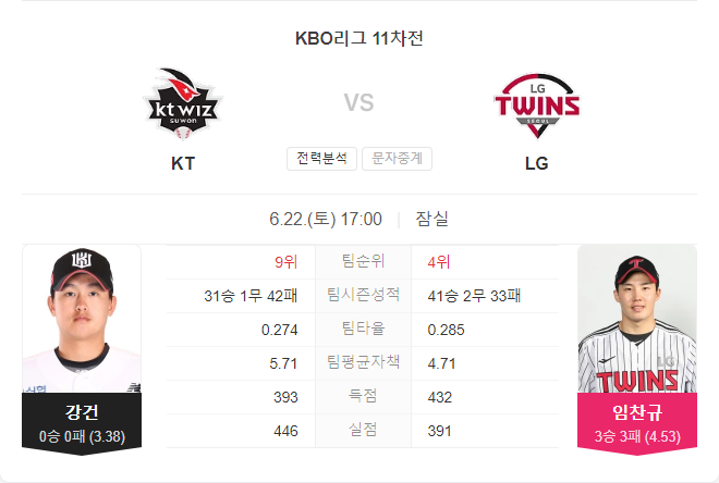 | 6월 23일 KBO 프로야구 KT 위즈 VS LG 트윈스 타카짱의 경기 예측 분석 (0) | 2024.06.23 |
