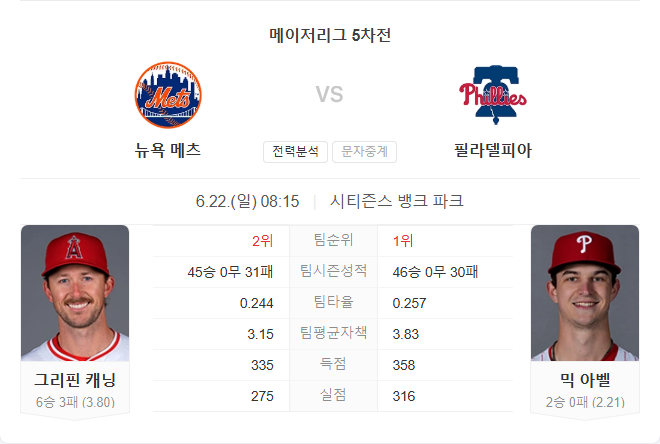 필라델피아는 타선과 마운드의 조화, 홈 강세, 그리고 루키 선발 아벨의 안정적인 투구까지 상승 요소가 많습니다. 반면, 뉴욕 메츠는 연패에 빠진 가운데 선발 캐닝이 원정에서 좋은 모습을 보여주고 있지만, 최근 팀 전체적으로 흐름이 매우 좋지 않습니다.