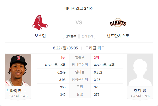 반면 샌프란시스코는 루프의 직전 경기 대량 실점 여파와 더불어 타선의 침체가 변수로 작용할 가능성이 높습니다. 홈에서의 성적은 우세하나, 상대 선발의 호투 가능성을 고려했을 때 보스턴이 근소하게 유리한 경기 흐름을 가져갈 전망입니다.