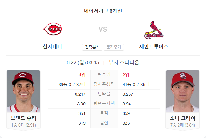 그레이는 홈에서 강한 성적을 보이고 있으며, 타선 또한 활발한 흐름을 이어가고 있어 전반적인 경기의 주도권은 세인트루이스에 있습니다. 신시내티는 불안한 마운드 운용으로 인해 초반 실점 후 추격에 나설 가능성이 높습니다.