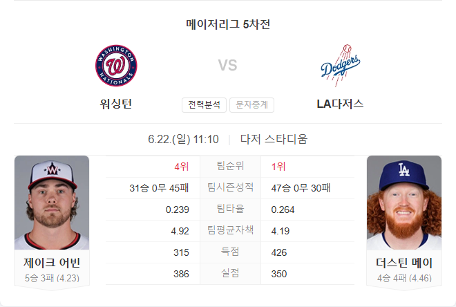 6월 22일 MLB 메이저리그 워싱턴 내셔널스 VS LA 다저스 타카짱의 경기 예측 분석