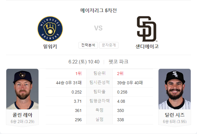 투수진은 평균자책점 3.67로 안정적이며, 이번 경기에 선발로 나서는 콜린 레아는 6승 2패, 평균자책점 3.29를 기록하고 있습니다.