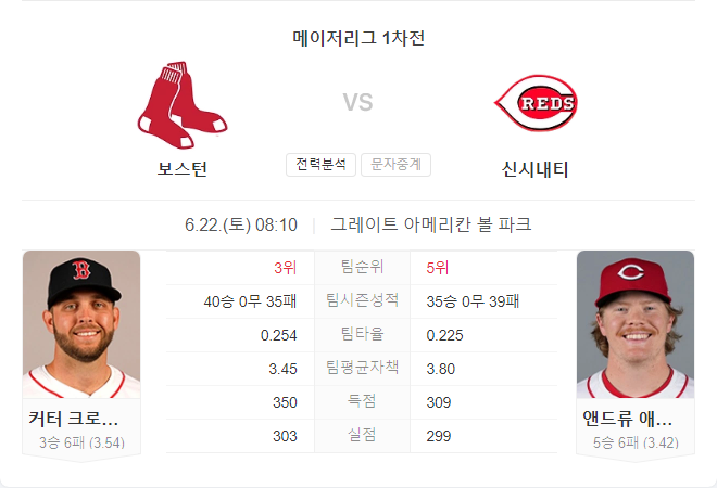 보스턴 레드삭스는 최근 상승세를 타고 있으며, 특히 타선이 강력한 모습을 보이고 있습니다. 쿠터 크로포드가 선발로 나서 안정적인 투구를 기대할 수 있는 반면, 신시내티 레즈는 타격에서 다소 약점을 보이고 있어 이번 경기에서 어려움을 겪을 가능성이 큽니다.
